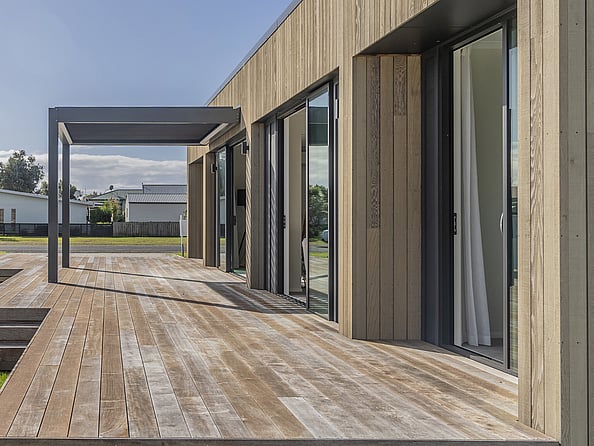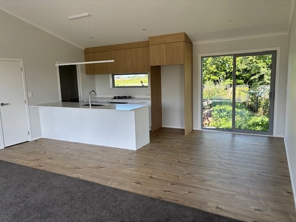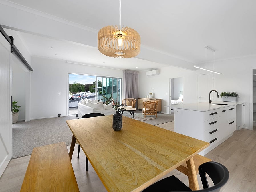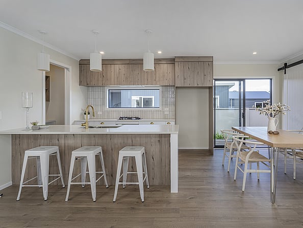 This stylish home showcases striking vertical cedar cladding and an effortless open-plan flow. The kitchen and scullery lead into generous living and dining areas that open to the outdoors – perfect for entertaining or unwinding.